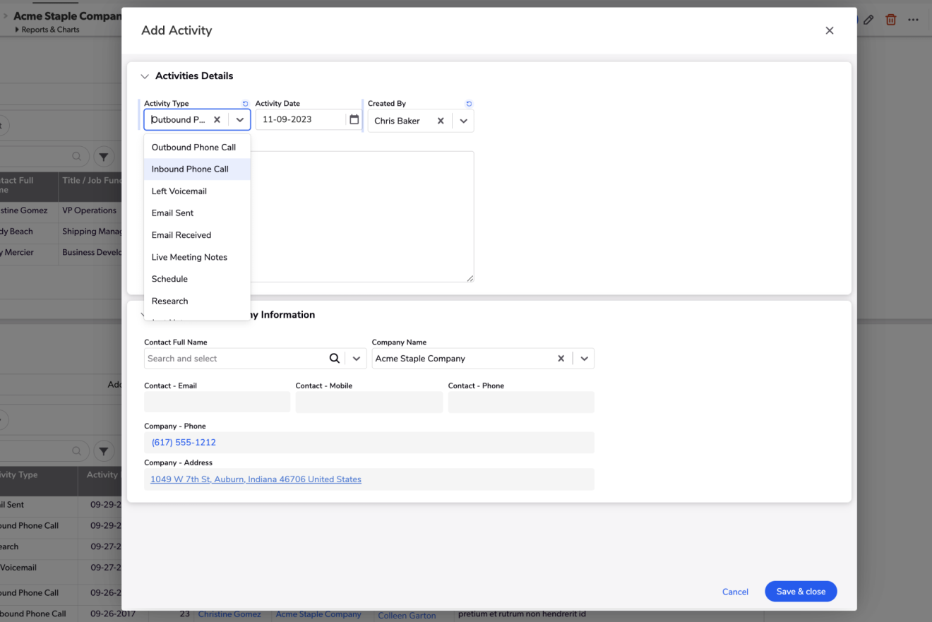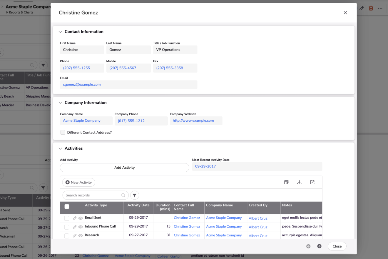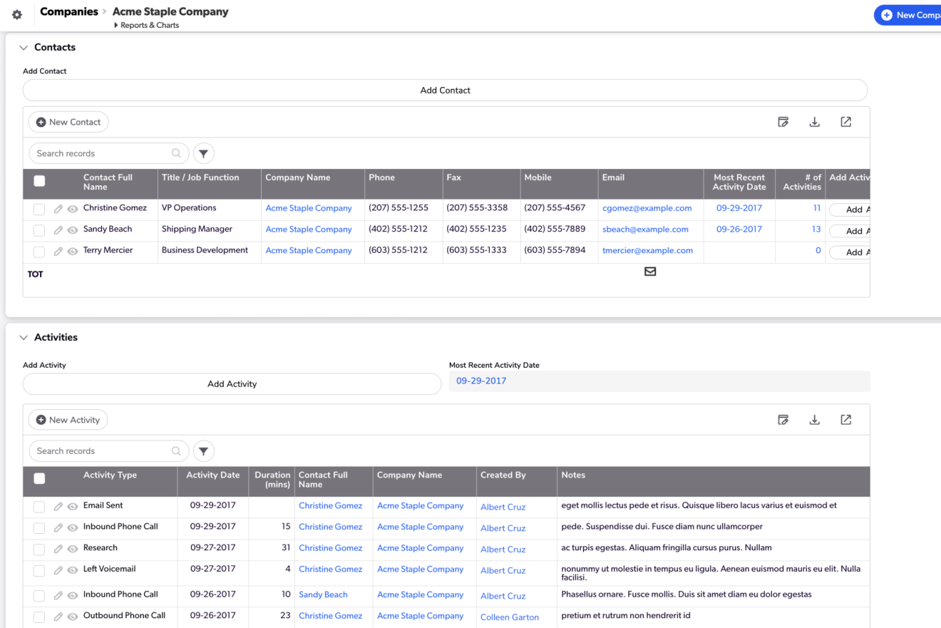 B2B Customer Relationship Management to track Customer companies and the activities with their contacts.