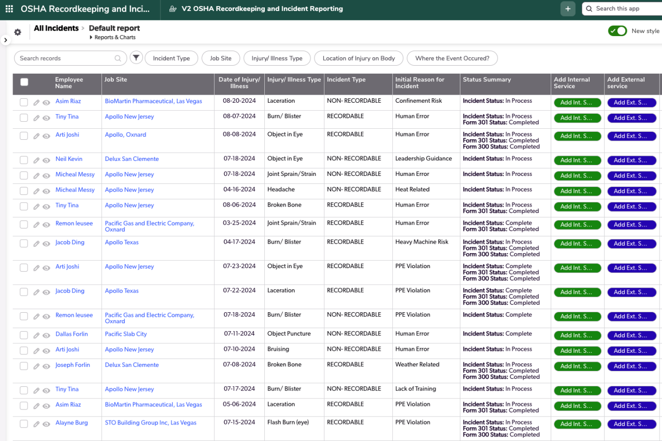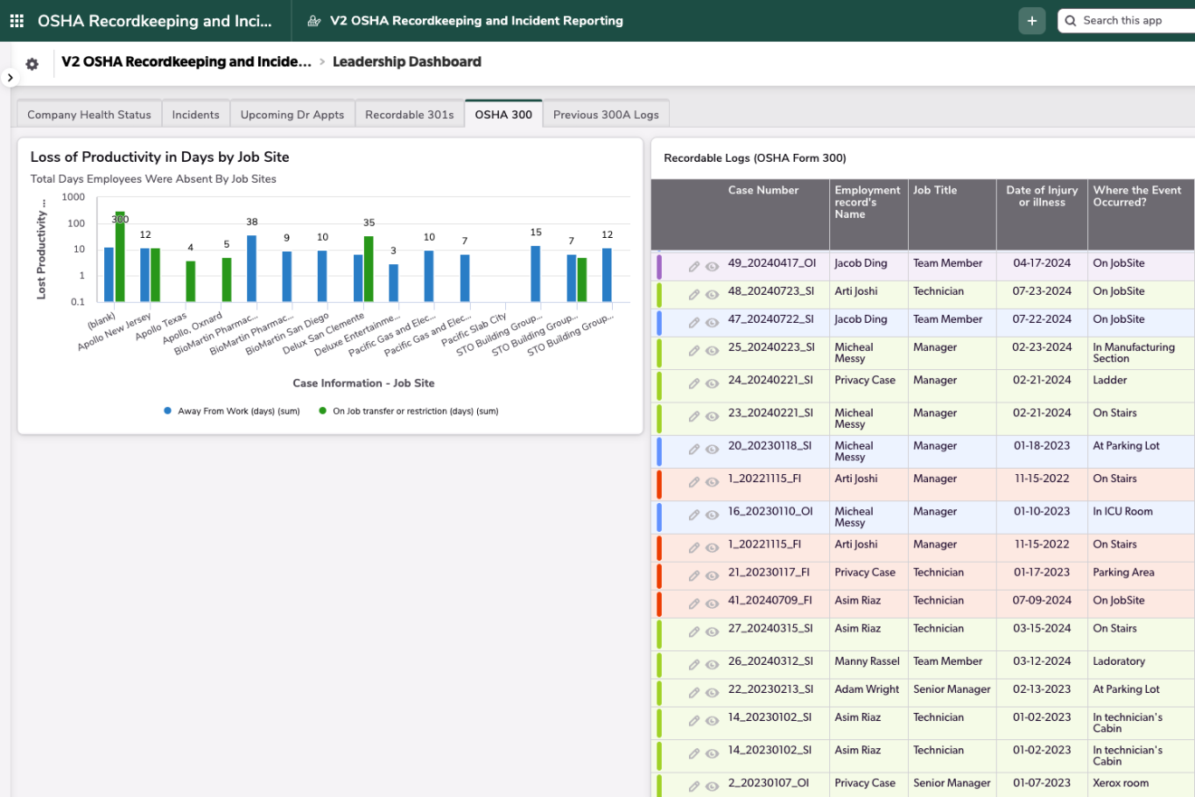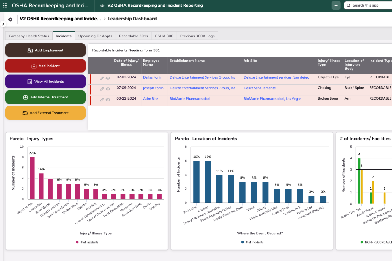 The OSHA Recordkeeping and Incident Tracking application encompasses all incidents, recordable and non-recordable, for a safety department's digital reporting needs. Beginning with logging all Incidents, the workflow from there can further go into OSHA Forms 301, 300, 300A for OSHA electronic reporting and regulation purposes for recordable incidents or can stop at the Incident phase for non recordables. This app is designed to add in multiple internal and external treatments and file attachments per incident to document the full story of each safety incident, no matter how large or small. With various reports and colorful dashboards, the safety team can see the full, live health of the company at the click of a button.