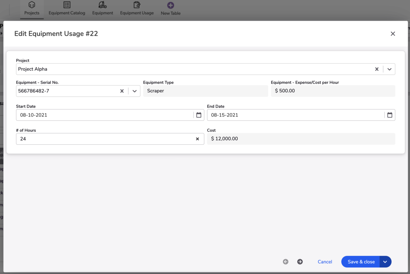 The Project Equipment Usage starter app helps project managers and team members track the usage of equipment in projects. Users can input equipment usage hours and allocate costs to specific projects. The app module is user-friendly and allows for real-time tracking, ensuring that project managers can make informed decisions about budgets and timelines.