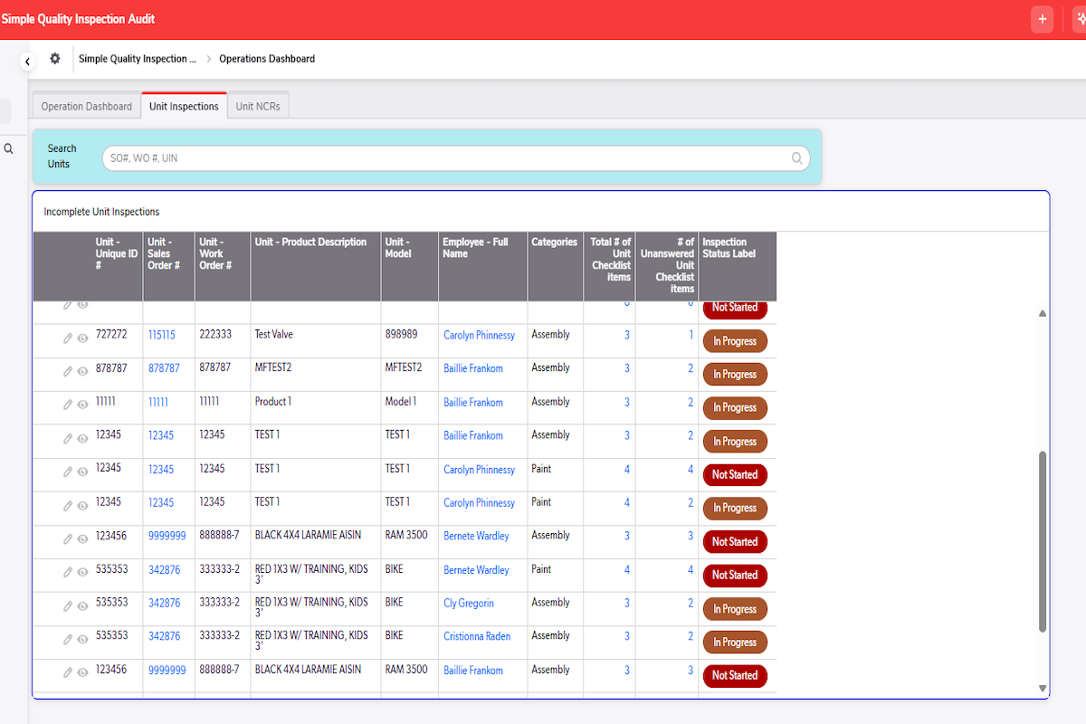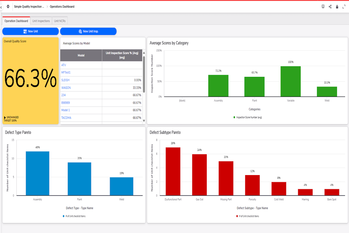 The Simple Quality Inspection Application is designed to provide a basic experience of inspecting units based off categorical checklist item templates and assigning defect corrective actions to record and fix any issues that are found. This application aims to reduce defects and contribute to the overall cost of poor quality (COPQ) reduction. This application is simply built, with one pipeline involved to fetch specific checklist items based on the category chosen on the Unit Inspections. Relationships are one to many across various tables. Additional pipelines may be required to be built by the end customer to connect Units and Employees to the end customer’s ERP or system of record, and if the end customer chooses to have inspection records auto generated when a new unit is created.