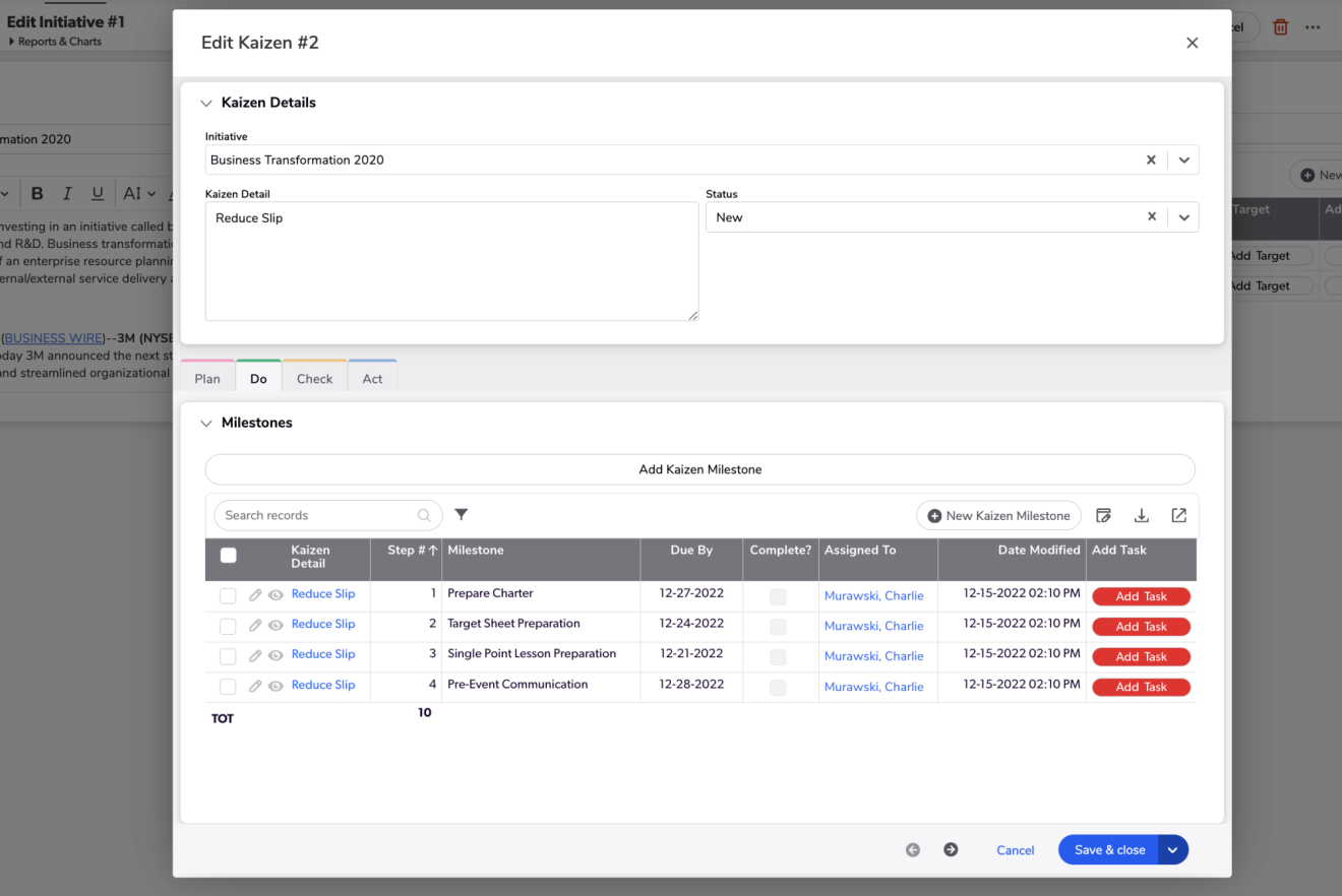 Task Management for Continuous Improvement projects in a Plan-Do-Check-Act format