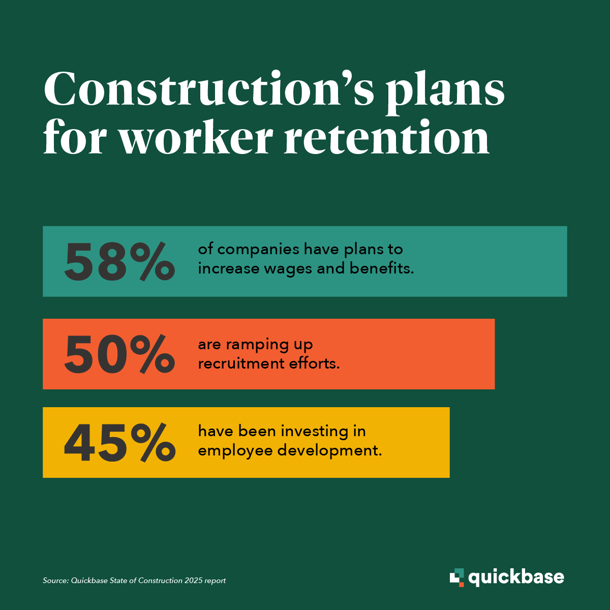 In 2025 and beyond, we’ll see a big shift as larger contractors start acquiring smaller ones. This trend will lead to the rise of mega-firms with the power to dominate the market. According to Bob Salaj, construction industry expert at Quickbase, “This consolidation will likely be driven by the need for greater efficiency, access to a broader customer base, and the ability to leverage advanced technologies.”